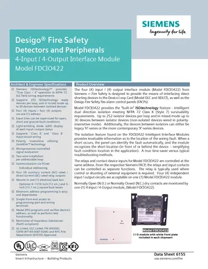 Datasheet for the Siemens FDCIO422, published in 2020. Document No: 6155, Rev: 9. Model FDCIO422. Engineering specifications, wiring diagrams, and mounting dimensions.