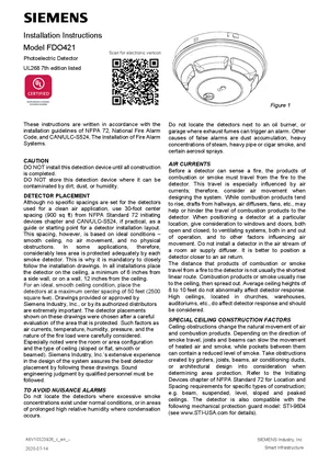 Installation Manual for the Siemens FDO421, published in 2020. Document No: A6V10323926, Rev: c. Model FDO421. Mounting instructions, wiring diagrams, and system power-up procedures.
