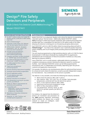 Datasheet for the Siemens FDOOT441, published in 2022. Document No: 6154, Rev: 11. Model FDOOT441. Detailed technical specifications, electrical ratings, and agency listings.