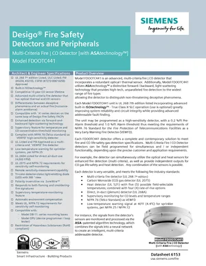 Datasheet for the Siemens FDOOTC441, published in 2022. Document No: 6153, Rev: 9. Model FDOOTC441. Product features, environmental operating limits, and compatibility data.