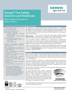 Datasheet for the Siemens FDOT421, published in 2022. Document No: 6150, Rev: 14. Model FDOT421. Detailed technical specifications, electrical ratings, and agency listings.