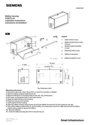Installation Manual for the Siemens FH2072-UA, published in 2019. Document No: A6V11272329, Rev: b. Model FH2072-UA. Physical installation guide, backbox dimensions, and cabling specifications.