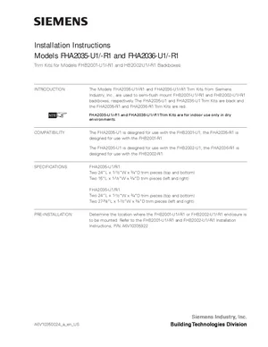 Installation Manual for the Siemens FHA2035 and FHA2036. Document No: A6V10350024, Rev: a. 4 models including FHA2035-U1, FHA2035-R1, FHA2036-U1 and 1 additional variants. Physical installation guide, backbox dimensions, and cabling specifications.