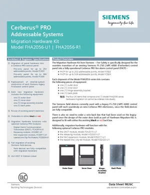 Datasheet for the Siemens FHA2056 Series Migration Kit, published in 2017. Document No: 9826C. Models FHA2056-U1 and FHA2056-R1. Detailed technical specifications, electrical ratings, and agency listings.