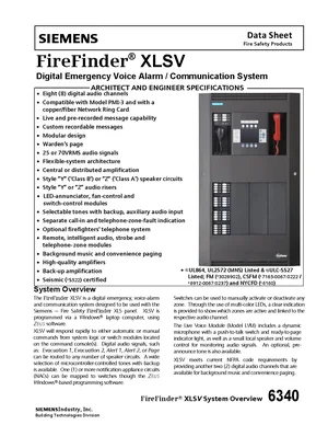 Datasheet for the Siemens FireFinder XLSV, published in 2017. Document No: 6340, Rev: 10. Model XLSV. Engineering specifications, wiring diagrams, and mounting dimensions.