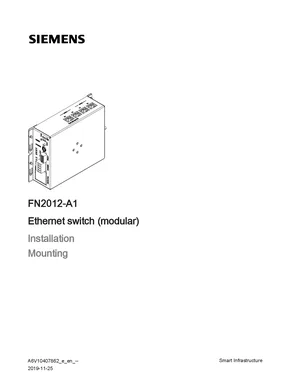 Installation Manual for the Siemens FN2012-A1, published in 2019. Document No: A6V10407862. Model FN2012-A1. Mounting instructions, wiring diagrams, and system power-up procedures.
