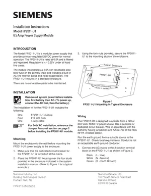 Installation Manual for the Siemens FP2011-U1. Document No: A6V10333499. Model FP2011-U1. Mounting instructions, wiring diagrams, and system power-up procedures.