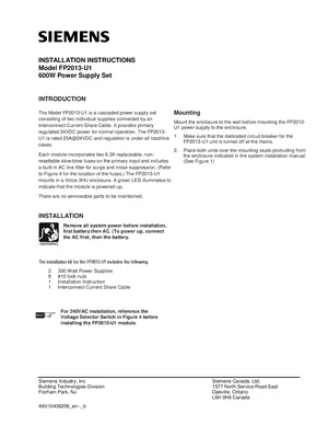 Installation Manual for the Siemens FP2013-U1. Document No: A6V10436206, Rev: b. Model FP2013-U1. Physical installation guide, backbox dimensions, and cabling specifications.