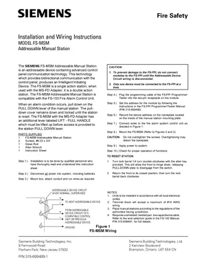 Installation Manual for the Siemens FS-MSM. Document No: 315-699489, Rev: 1. Model FS-MSM. Physical installation guide, backbox dimensions, and cabling specifications.