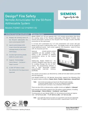 Datasheet for the Siemens FSD901-U2 and FSD901-R2, published in 2020. Document No: 6817, Rev: 4. Models FSD901-U2 and FSD901-R2. Detailed technical specifications, electrical ratings, and agency listings.