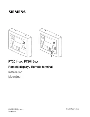 Installation Manual for the Siemens FT2014 and FT2015, published in 2019. Document No: A6V10315046, Rev: g. Models FT2014 and FT2015. Physical installation guide, backbox dimensions, and cabling specifications.