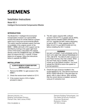 Installation Manual for the Siemens IEC-1. Document No: 315-092051-4. Model IEC-1. Physical installation guide, backbox dimensions, and cabling specifications.