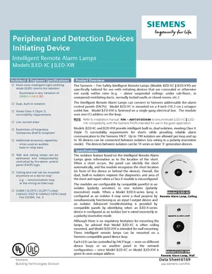 Datasheet for the Siemens ILED-XC and ILED-XW, published in 2017. Document No: 6169, Rev: 0. Models ILED-XC and ILED-XW. Product features, environmental operating limits, and compatibility data.