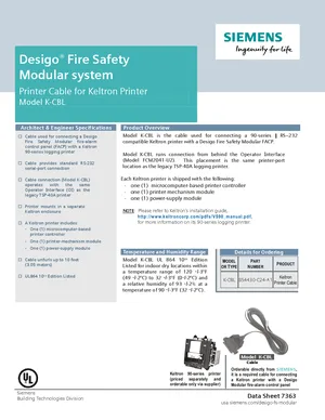 Datasheet for the Siemens K-CBL, published in 2018. Document No: 7363, Rev: 0. Model K-CBL. Product features, environmental operating limits, and compatibility data.