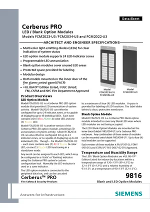 Datasheet for the Siemens LED and Blank Option Modules, published in 2013. Document No: 9816, Rev: 2. Models FCM2023-U3, FCM2034-U3 and FCM2022-U3. Engineering specifications, wiring diagrams, and mounting dimensions.
