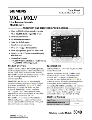 Datasheet for the Siemens LIM-1, published in 2011. Document No: 5040, Rev: 1. Model LIM-1. Product features, environmental operating limits, and compatibility data.