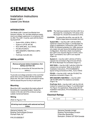 Installation Manual for the Siemens LLM-1. Document No: 315-093530-7, Rev: 7. Model LLM-1. Physical installation guide, backbox dimensions, and cabling specifications.