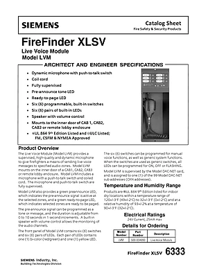 Datasheet for the Siemens LVM for FireFinder XLSV, published in 2010. Document No: 6333, Rev: 2. Model LVM. Engineering specifications, wiring diagrams, and mounting dimensions.