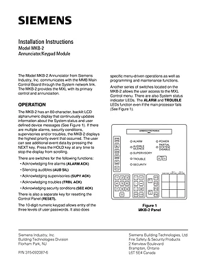 Installation Manual for the Siemens MKB-2. Document No: 315-092087-6. Model MKB-2. Hardware installation, terminal connections, and environmental requirements.