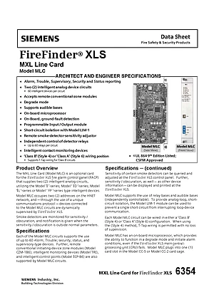 Datasheet for the Siemens MLC for FireFinder XLS, published in 2012. Document No: 6354, Rev: 2. Model MLC. Detailed technical specifications, electrical ratings, and agency listings.