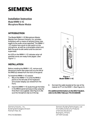 Installation Manual for the Siemens MMM-1. Document No: 315-092098-5. Models MMM-1 and MMM-1C. Physical installation guide, backbox dimensions, and cabling specifications.