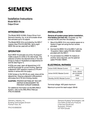 Installation Manual for the Siemens MOD-16. Document No: 315-090830-8, Rev: 8. Model MOD-16. Mounting instructions, wiring diagrams, and system power-up procedures.