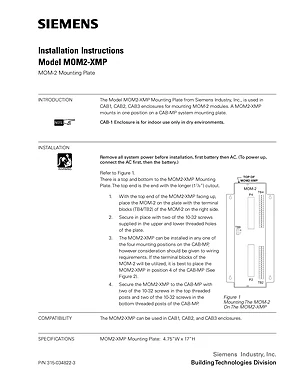 Installation Manual for the Siemens MOM2-XMP. Document No: 315-034822-3. Model MOM2-XMP. Physical installation guide, backbox dimensions, and cabling specifications.