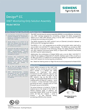 Datasheet for the Siemens MOSA for Desigo CC, published in 2019. Document No: 5083, Rev: 3. Model MOSA. Product features, environmental operating limits, and compatibility data.