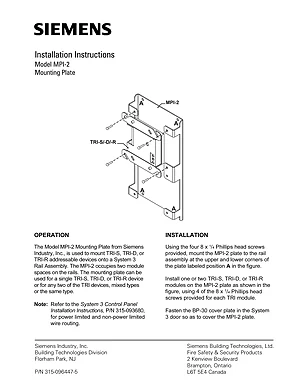 Installation Manual for the Siemens MPI-2. Document No: 315-096447-5. Model MPI-2. Physical installation guide, backbox dimensions, and cabling specifications.