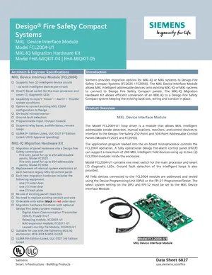 Datasheet for the Siemens MXL-IQ Migration Hardware, published in 2020. Document No: 6827, Rev: 2. Models FCL2004-U1, FHA-MIQKIT-04 and FHA-MIQKIT-05. Product features, environmental operating limits, and compatibility data.
