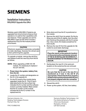 Installation Manual for the Siemens MXL/MXLV Upgrade Kits. Document No: 315-096210-5. Models MXL and MXLV. Hardware installation, terminal connections, and environmental requirements.