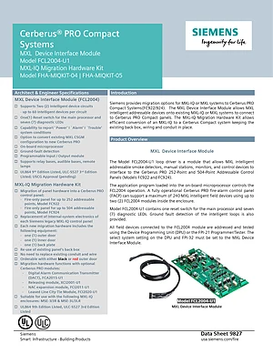 Datasheet for the Siemens MXL Device Interface Module, published in 2020. Document No: 9827, Rev: 2. Models FCL2004-U1, FHA-MIQKIT-04 and FHA-MIQKIT-05. Engineering specifications, wiring diagrams, and mounting dimensions.