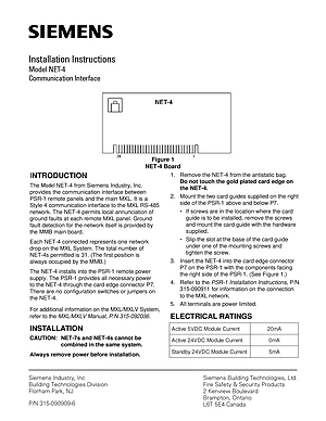 Installation Manual for the Siemens NET-4. Document No: 315-090909-6, Rev: 6. Model NET-4. Mounting instructions, wiring diagrams, and system power-up procedures.