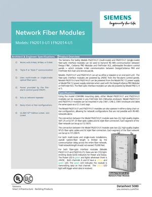 Datasheet for the Siemens Network Fiber Modules, published in 2021. Document No: 5080, Rev: 3. Models FN2013-U1 and FN2014-U1. Product features, environmental operating limits, and compatibility data.
