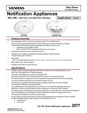 Datasheet for the Siemens NH and NS Series Notification Appliances, published in 2015. Document No: 2577, Rev: 2. 6 models including NS-MC-CR, NS-MC-CW, NS-HMC-CR and 3 additional variants. Product features, environmental operating limits, and compatibility data.