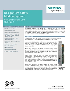 Datasheet for the Siemens NIC-C, published in 2017. Document No: 7338, Rev: 0. Model NIC-C. Product features, environmental operating limits, and compatibility data.