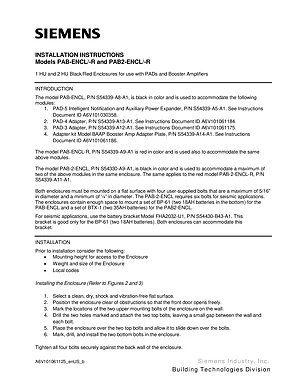 Installation Manual for the Siemens PAB-ENCL and PAB2-ENCL. Document No: A6V101061125, Rev: b. 4 models including PAB-ENCL, PAB-ENCL-R, PAB2-ENCL and 1 additional variants. Hardware installation, terminal connections, and environmental requirements.