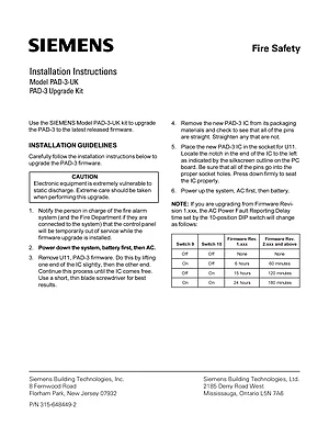 Installation Manual for the Siemens PAD-3-UK. Document No: 315-648449-2. Model PAD-3-UK. Mounting instructions, wiring diagrams, and system power-up procedures.