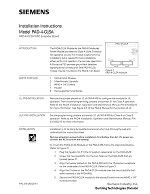 Installation Manual for the Siemens PAD-4-CLSA. Document No: 315-050254-1. Model PAD-4-CLSA. Hardware installation, terminal connections, and environmental requirements.