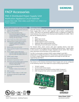 Datasheet for the Siemens PAD-4, published in 2024. Document No: 3363, Rev: 8. 19 models including PAD-4, PAD-4-MB, PAD-4-ENCL and 16 additional variants. Product features, environmental operating limits, and compatibility data.