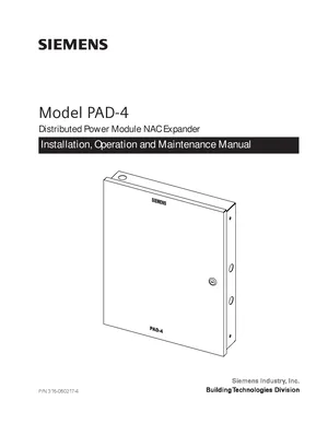 Installation, Operations, and Programming Manual for the Siemens PAD-4. Document No: 315-050217-4, Rev: 4. 8 models including PAD-4, PAD-4-CLSA, PAD-4-MB and 5 additional variants. Complete system installation, daily operation procedures, and detailed programming configurations.