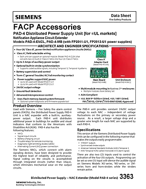 Datasheet for the Siemens PAD-4 Series, published in 2017. Document No: 3363, Rev: 6. 12 models including PAD-4-ENCL, PAD-4-MB, PAD-4-CLSA and 9 additional variants. Product features, environmental operating limits, and compatibility data.
