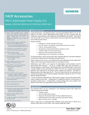 Datasheet for the Siemens PAD-5, published in 2023. Document No: 3364, Rev: 3. 16 models including PAD5-6A, PAD5-6A-R, PAD5-9A and 13 additional variants. Engineering specifications, wiring diagrams, and mounting dimensions.