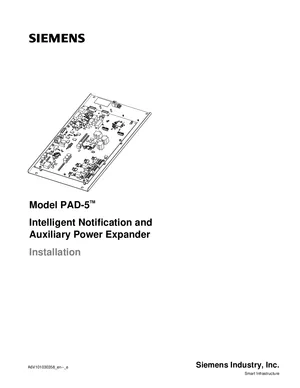 Installation Manual for the Siemens PAD-5, published in 2025. Document No: A6V101030358, Rev: e. 7 models including PAD-5, PAD-5-MB, PAD-5-CDC and 4 additional variants. Mounting instructions, wiring diagrams, and system power-up procedures.