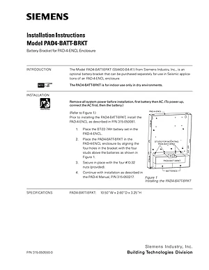 Installation Manual for the Siemens PAD4-BATT-BRKT. Document No: 315-050550-0. Model PAD4-BATT-BRKT. Physical installation guide, backbox dimensions, and cabling specifications.
