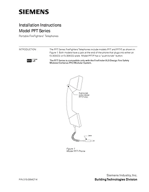 Installation Manual for the Siemens PFT Series FireFighters' Telephones. Document No: 315-099427-4. Models PFT and PFT-P. Hardware installation, terminal connections, and environmental requirements.