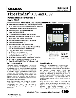 Datasheet for the Siemens PMI-3 for FireFinder XLS, published in 2016. Document No: 6359, Rev: Rev. 2. Model PMI-3. Engineering specifications, wiring diagrams, and mounting dimensions.