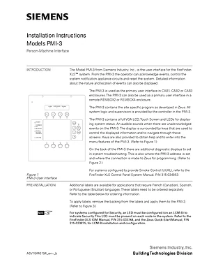 Installation Manual for the Siemens PMI-3 for FireFinder XLS. Document No: A6V10446194, Rev: b. Model PMI-3. Physical installation guide, backbox dimensions, and cabling specifications.