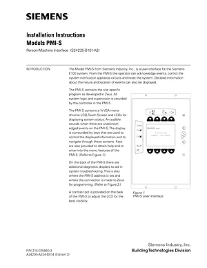 Installation Manual for the Siemens PMI-S, published in 2011. Document No: 315-035860-3, Rev: Edition 3. Model PMI-S. Physical installation guide, backbox dimensions, and cabling specifications.