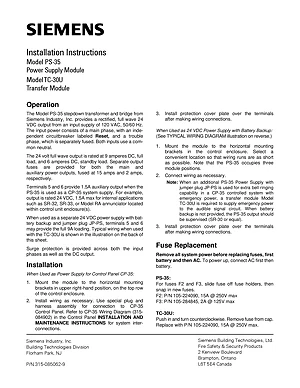 Installation Manual for the Siemens PS-35 and TC-30U. Document No: 315-085062-9. Models PS-35 and TC-30U. Hardware installation, terminal connections, and environmental requirements.